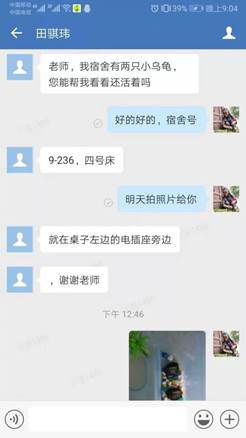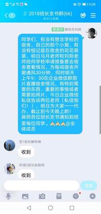 广而告之,收集心愿。“暖心活动”提前向学校疫情防控指挥部、学工部等报备,上级部门审批通过后,学院学生工作老师通过QQ群、企业微信群等方式告知学生活动的具体内容,收集每个学生的心愿。学生们兴奋不已,非常假期居家上网课的他们,早已迫不及待想看看自己的“小窝”。“老师,我的电脑您帮我带出来吧,我上网课用手机不方便,谢谢您!”“老师,您帮我看看宿舍的多肉还活着吗?帮忙浇下水,谢谢老师。”“老师,给213宿舍拍张照呗,挺想念的。”“老师,您帮我把柜子里的短袖带出来吧,天气热了,没衣服穿了。”面对孩子们每个小心愿,学工老师竭尽所能,一一满足。